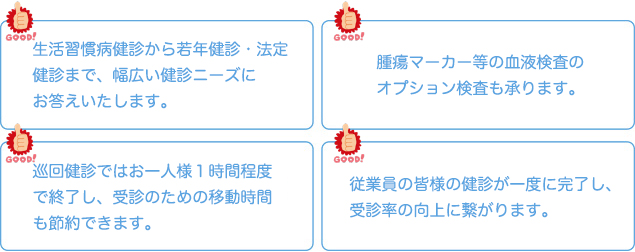 ※X線検査以外の計測、心電図検査、診察、採血は、貴事業場の会議室等を健診会場としてお借りします。